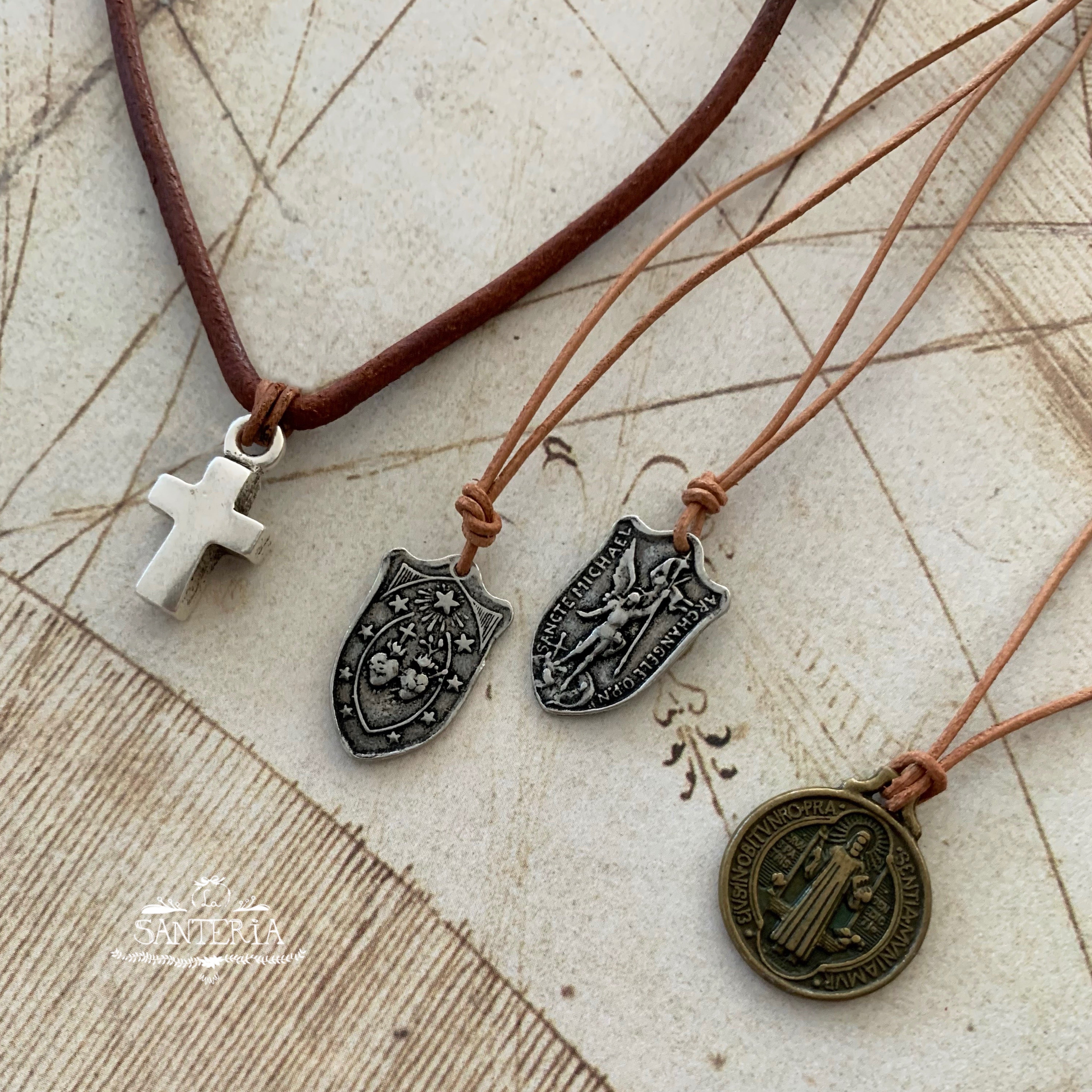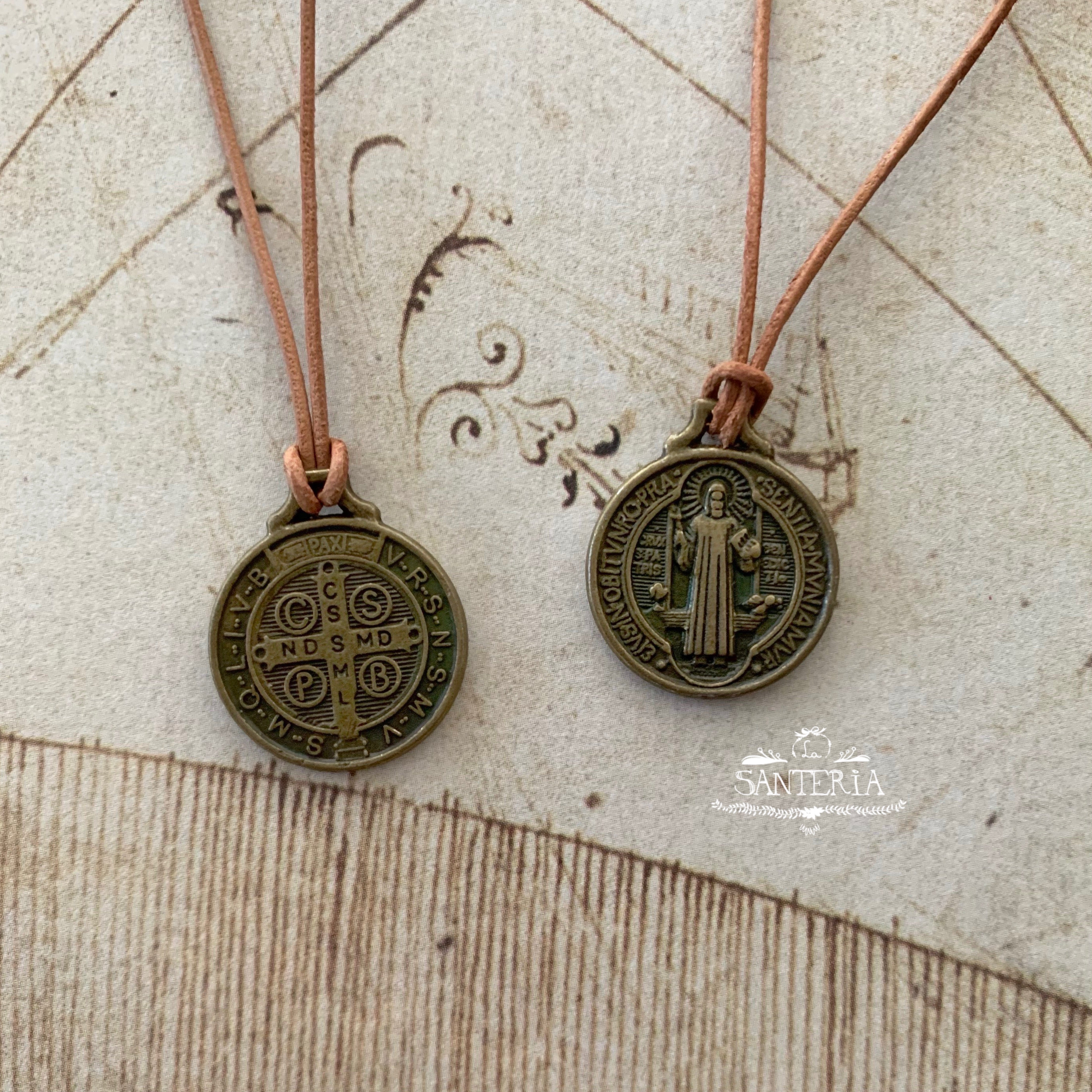 Lleva contigo la protección y bendición de San Benito en un diseño moderno y cómodo. Con su correa de cuero autoajustable, este collar se adapta a ti con estilo y significado.