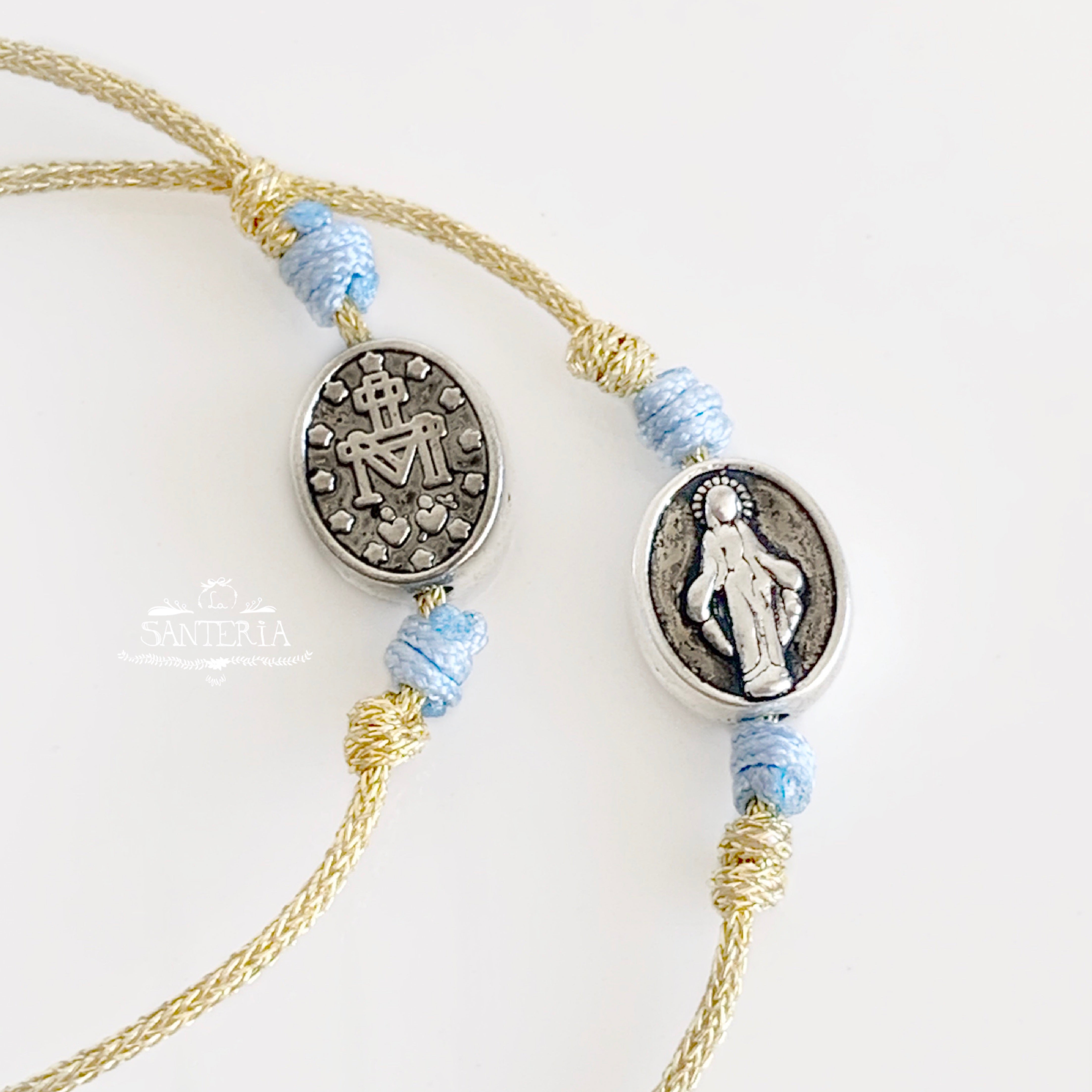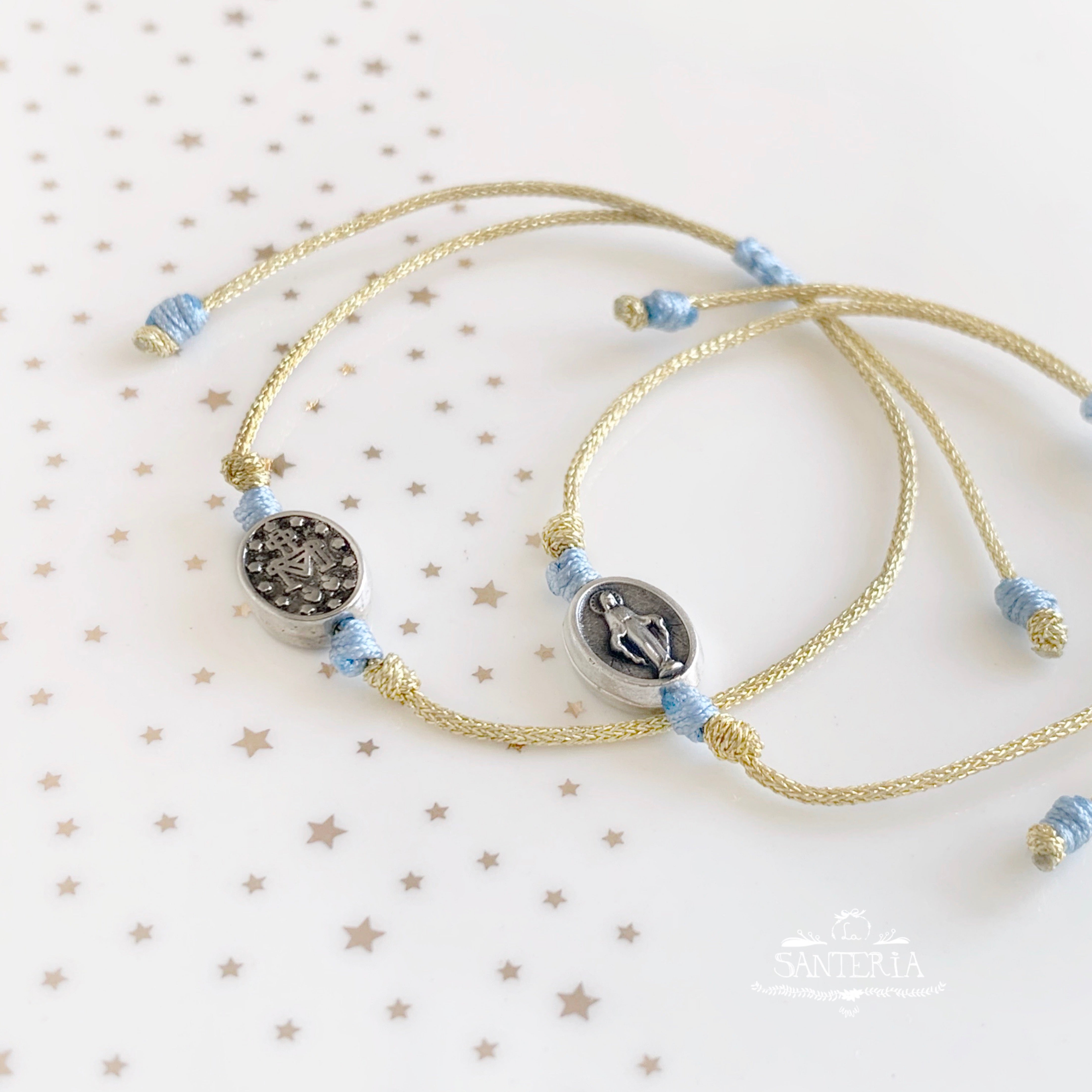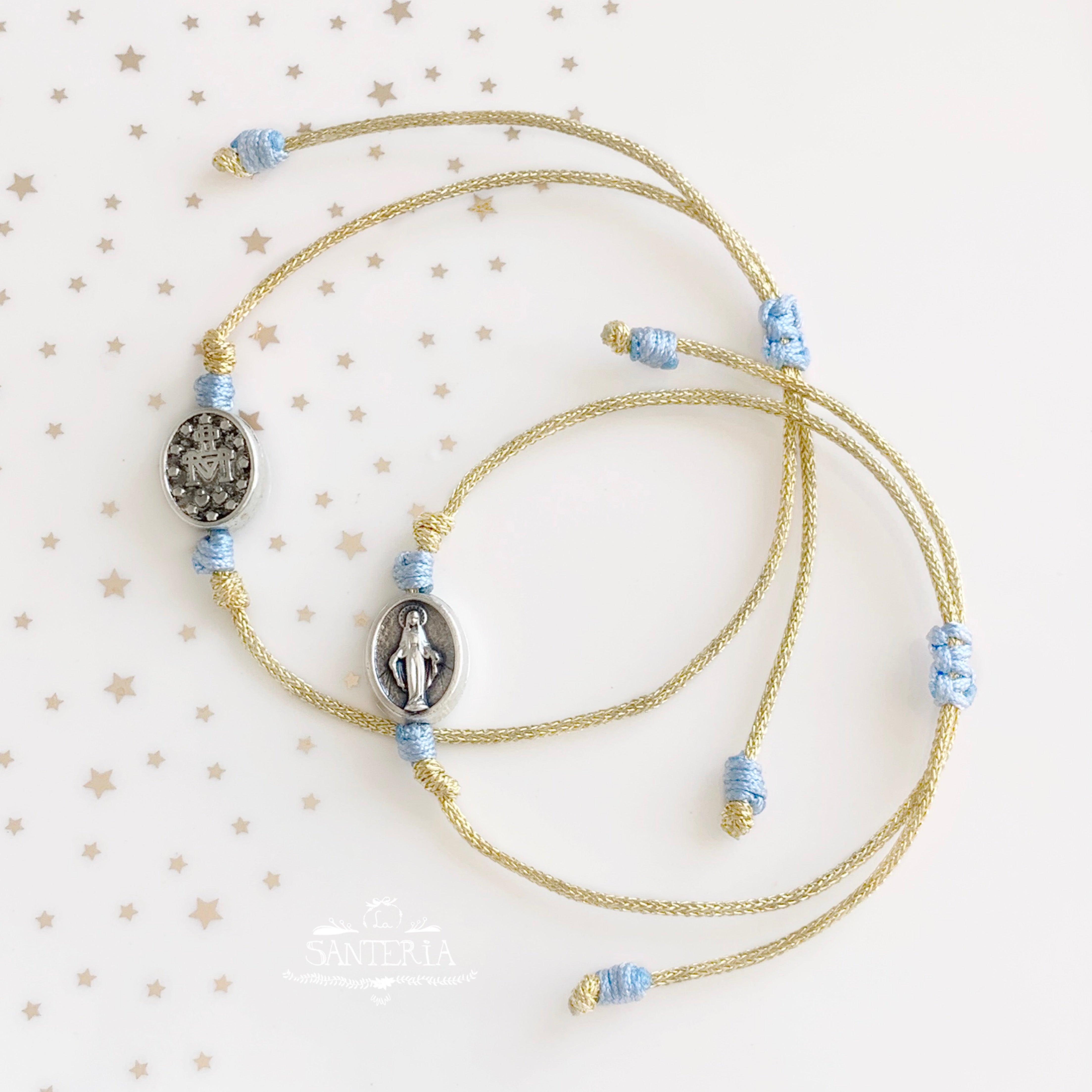 Esta delicada pulsera está elaborada con hilo dorado y detalles en azul claro, destacando la Medalla Milagrosa en el centro. Su diseño minimalista y elegante la hace perfecta para llevar contigo un símbolo de protección y fe todos los días.