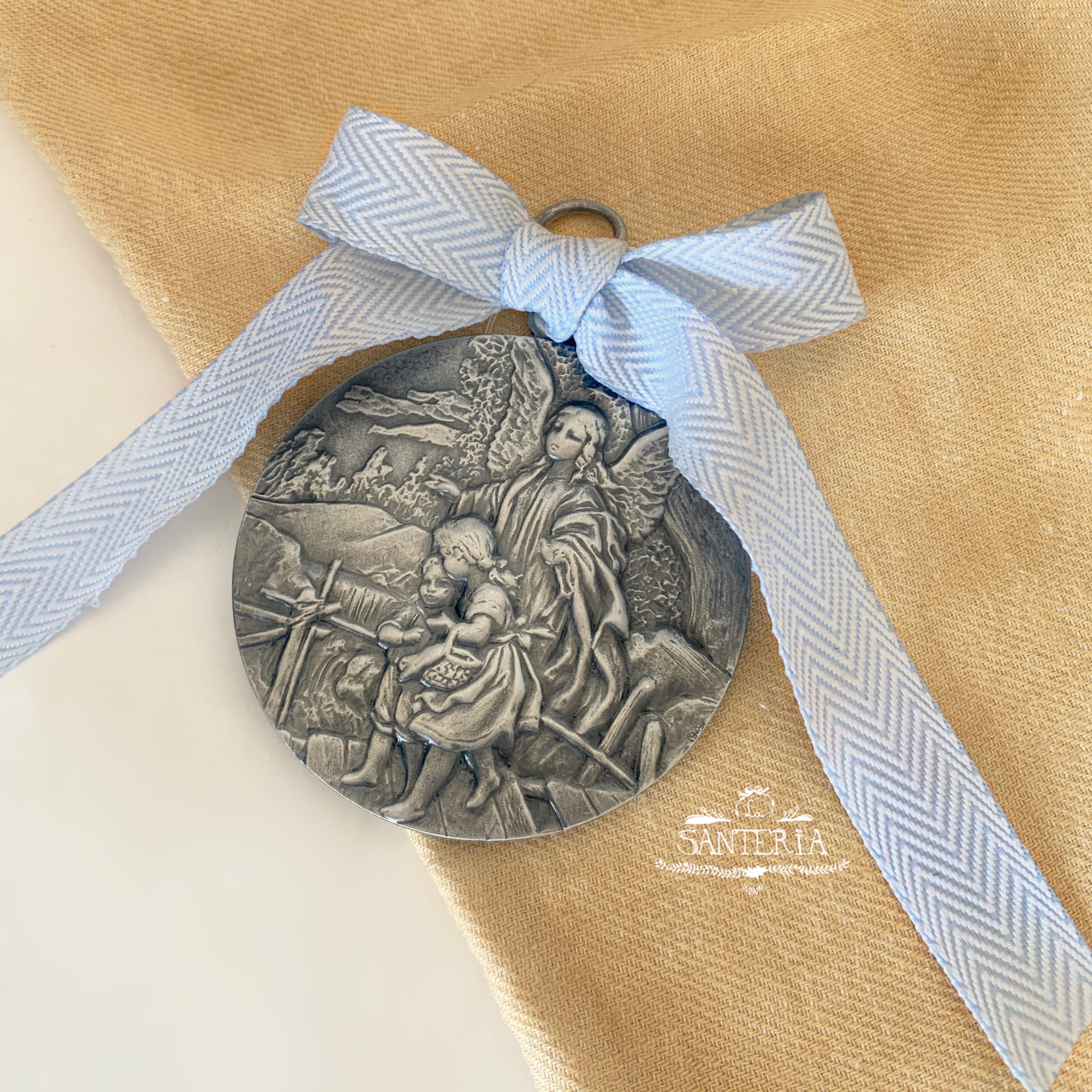 Modelo III : Cunero grande Ángel de la Guarda con niños en el campo, cinta celeste