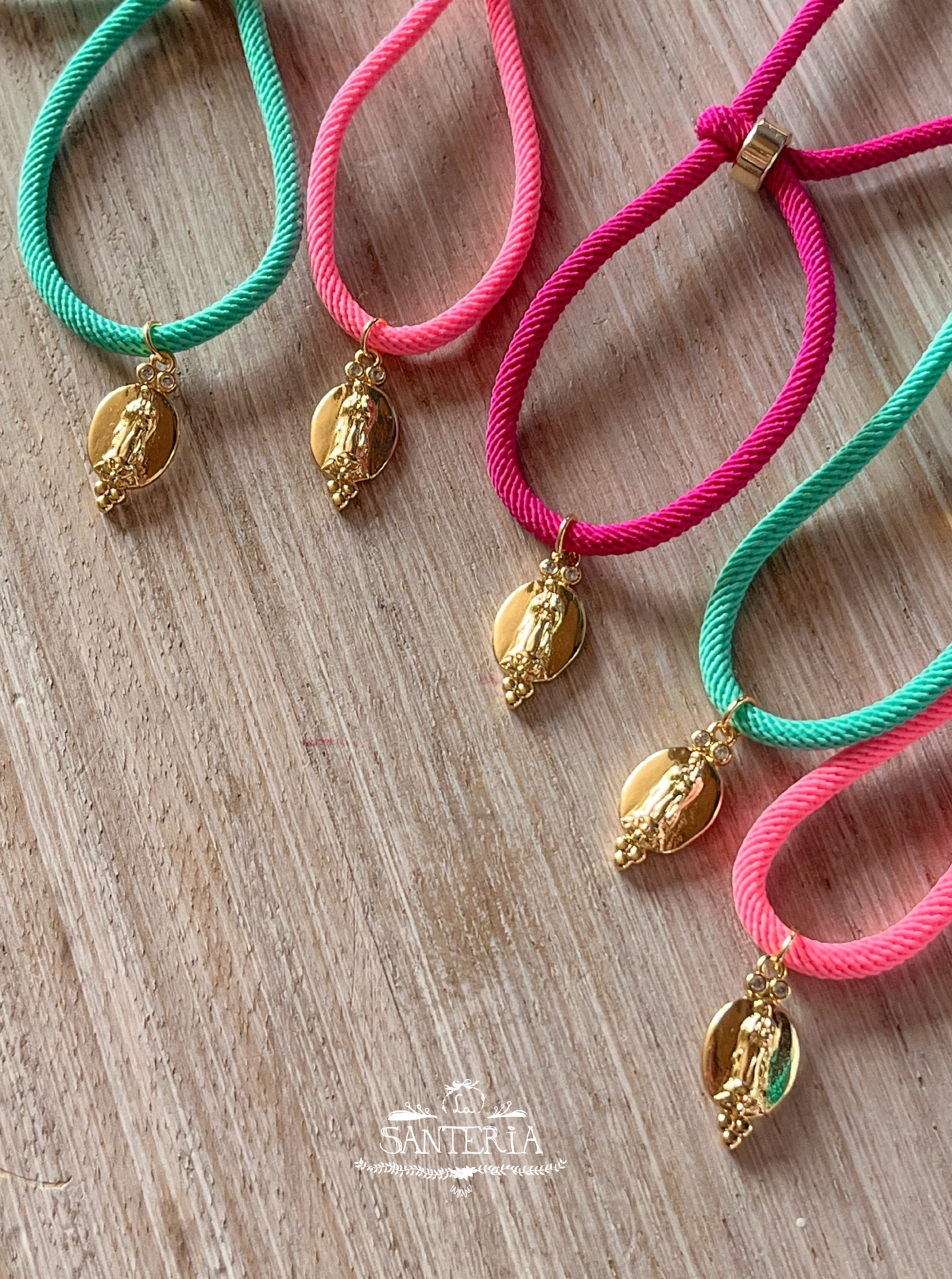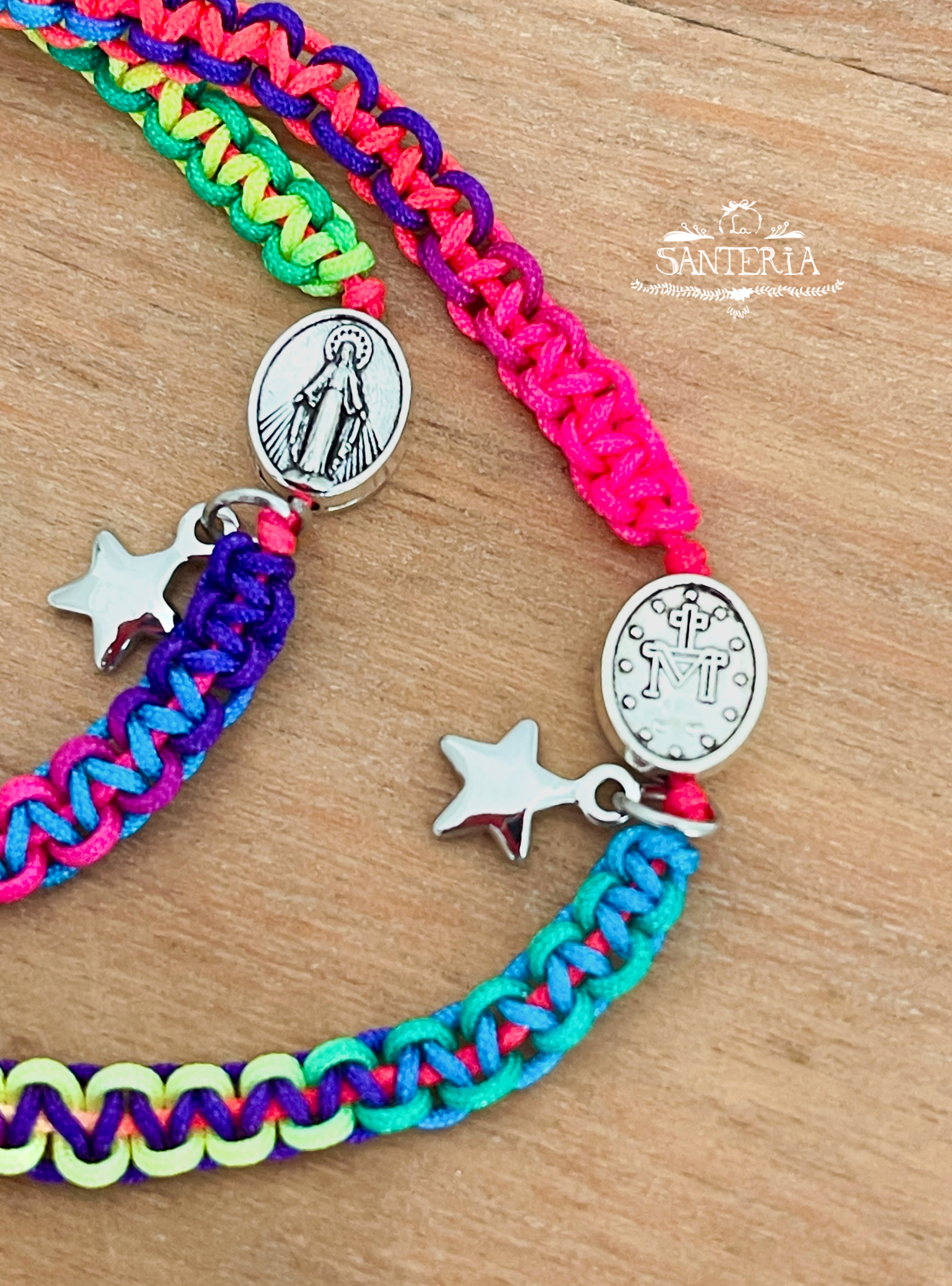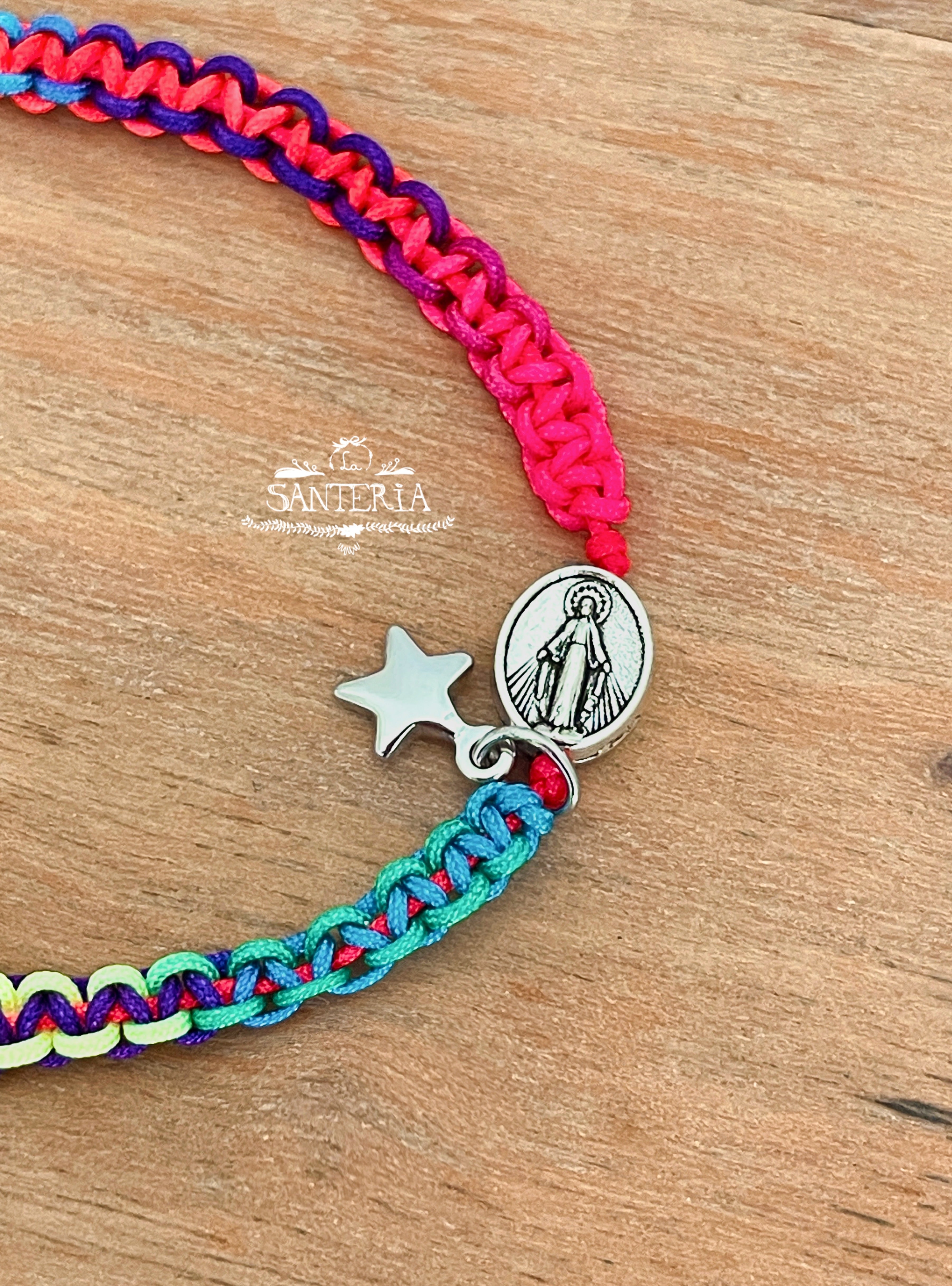 Pulsera tejida multicolor Virgen de la Medalla Milagrosa y Estrella Guía