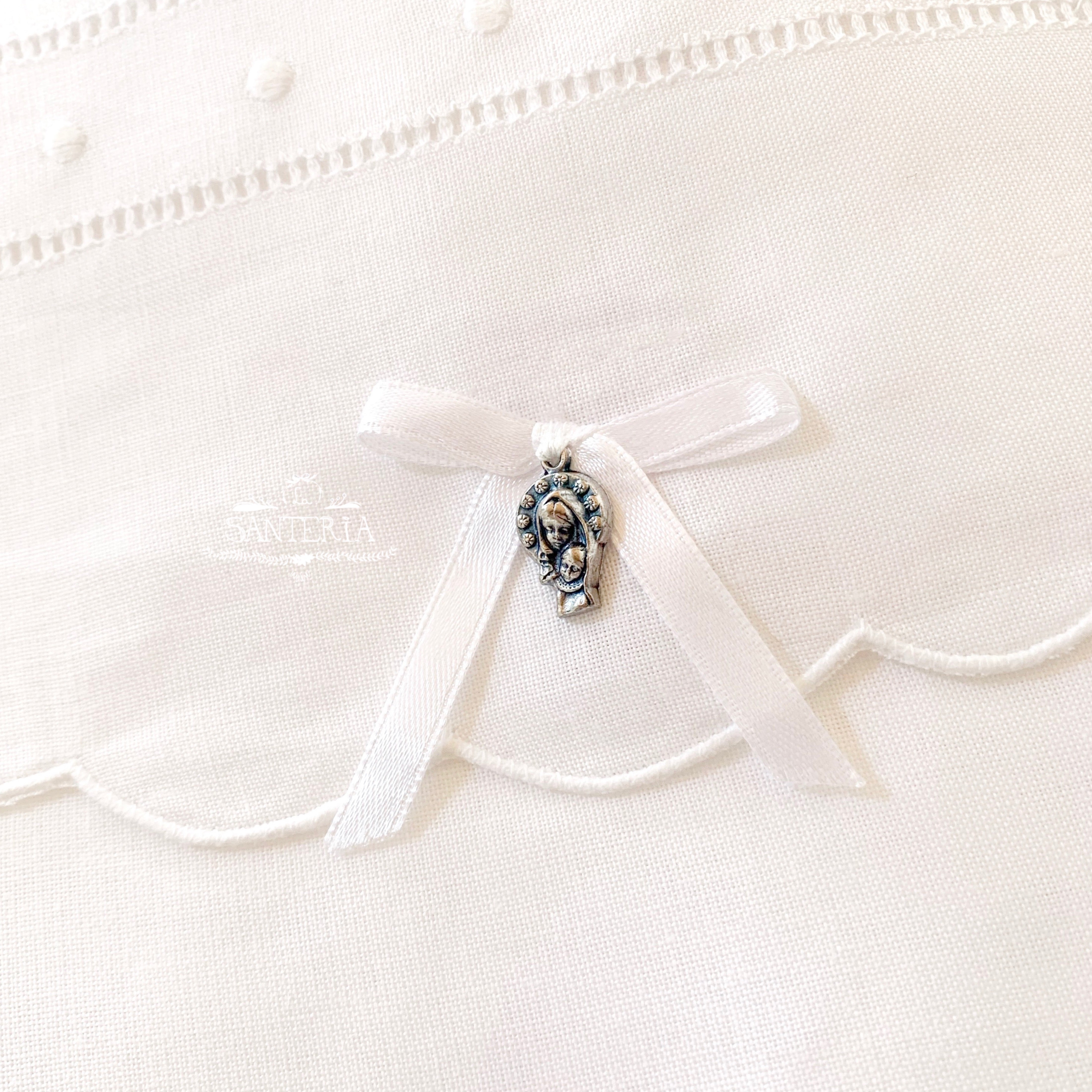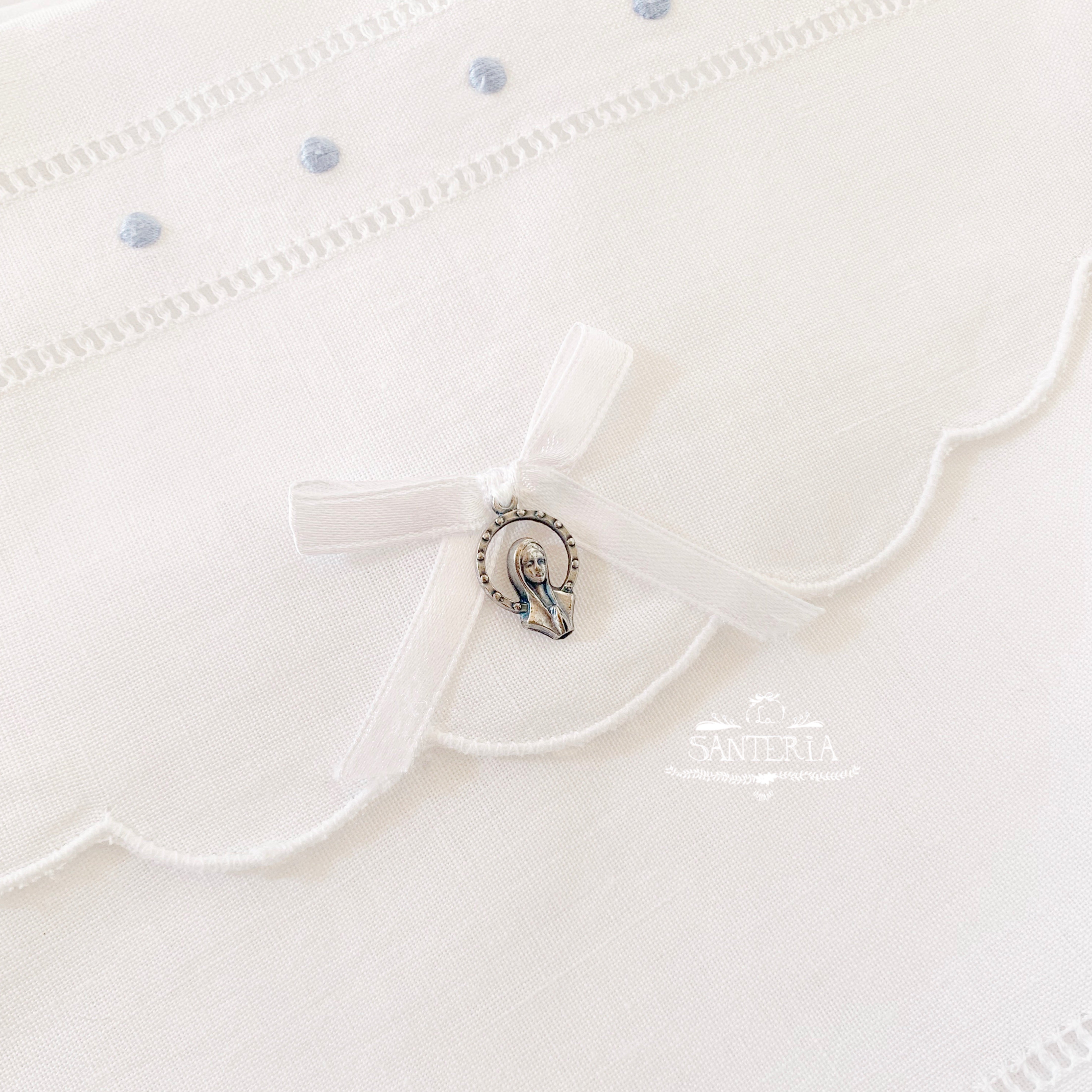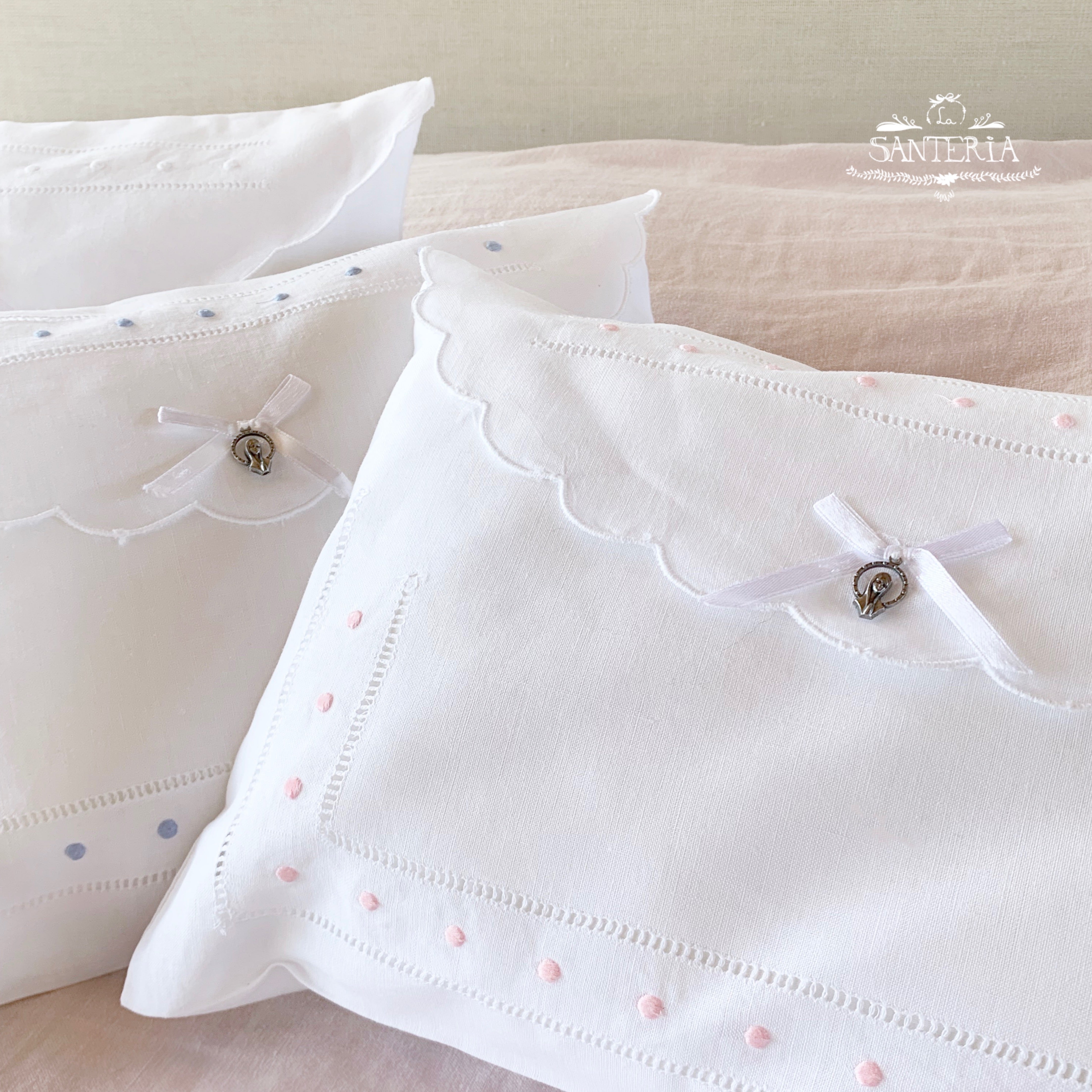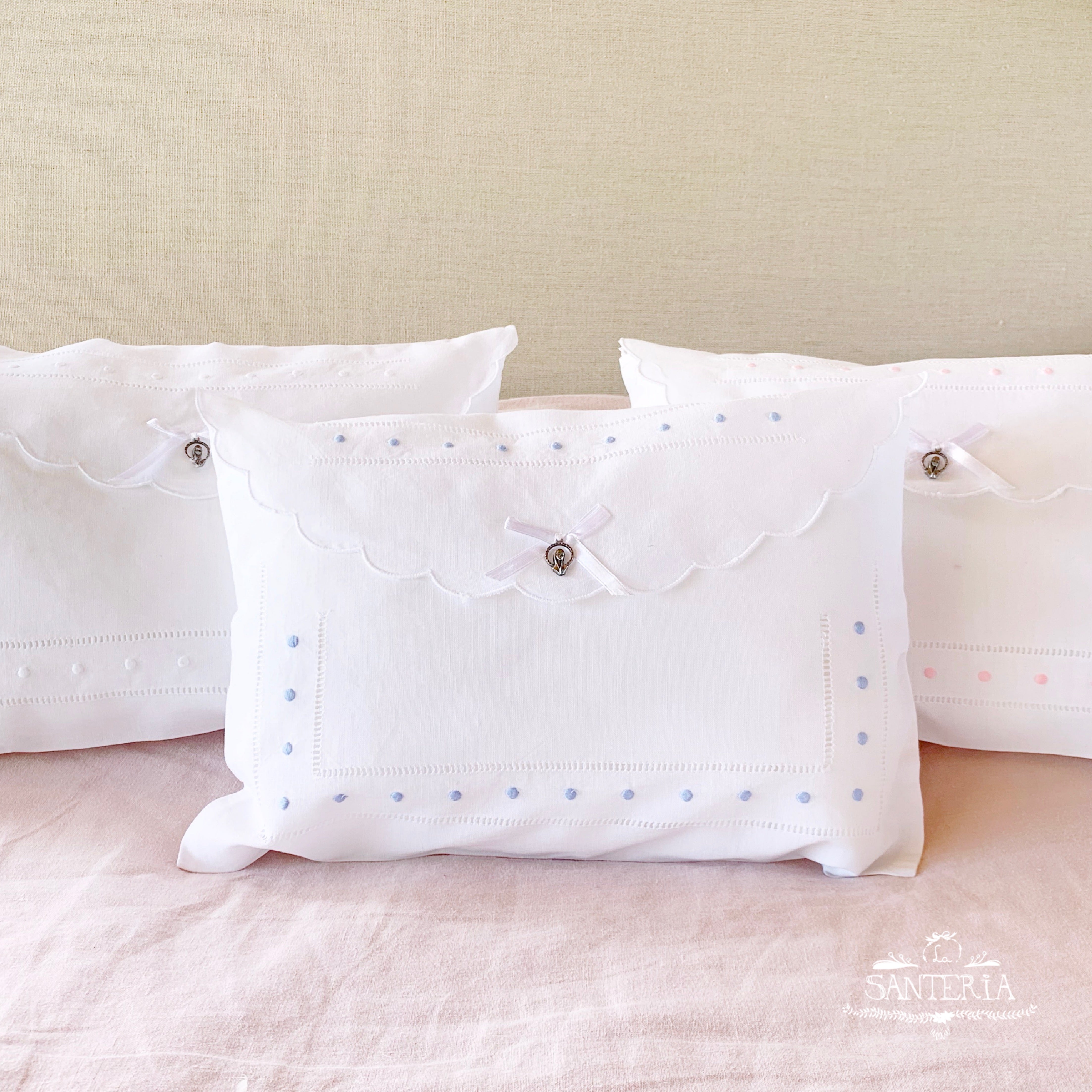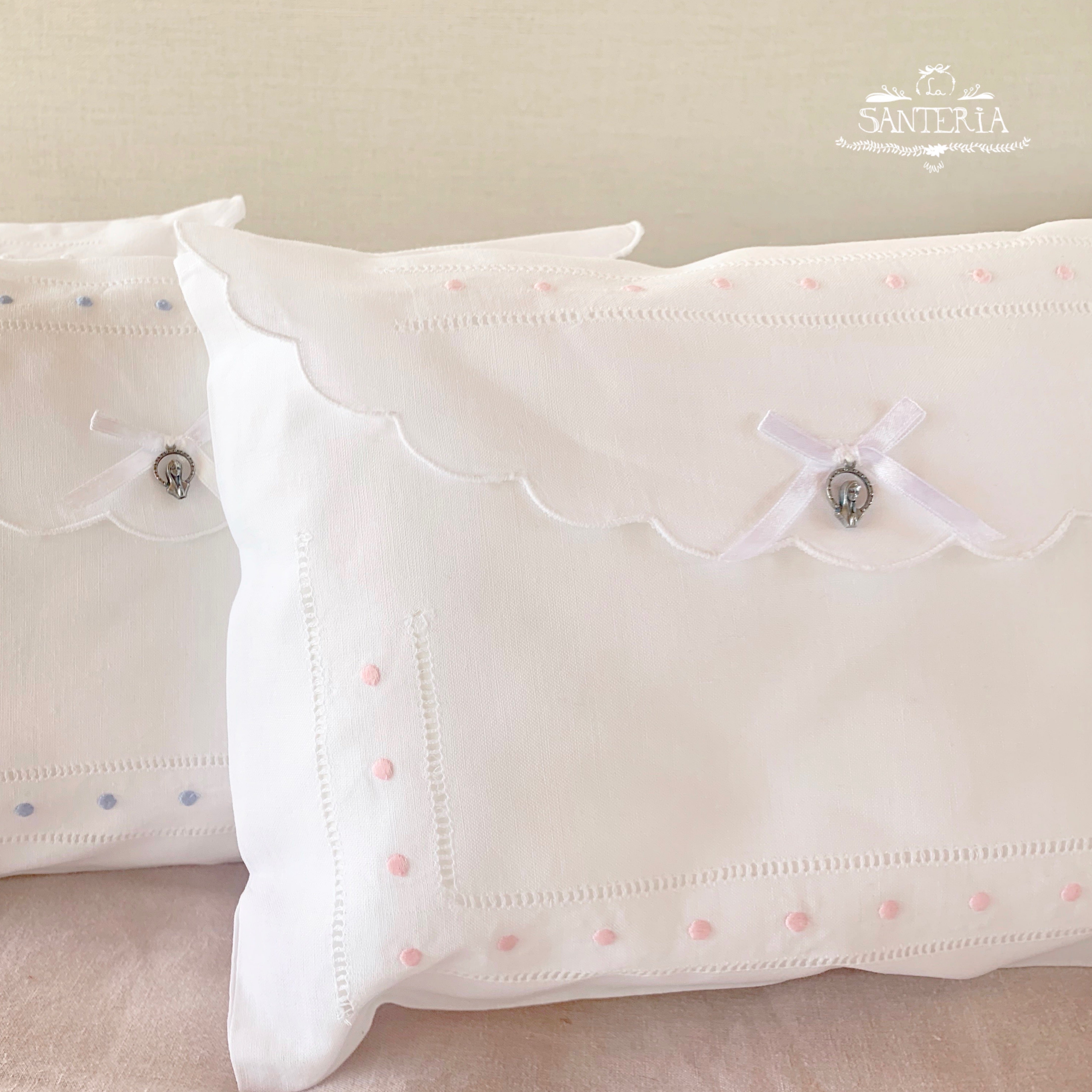 Cojín bordado con medalla para cunas.